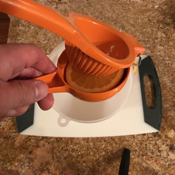 To use, place half of an orange in the squeezer with the cut side facing down. This allows the juice to drain directly out of the holes. Squeezing the handles together inverts the orange peel, guaranteeing that the maximum volume of juice is produced.
