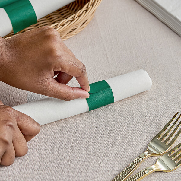 Featuring a rich hunter green color, these napkin bands add an attractive touch to your dining area. Perfect for holding rolled napkins and flatware securely in place, these bands are a must-have for restaurants, cafes, and catered events. Ensure a seamless dining experience with these stylish and practical napkin bands!