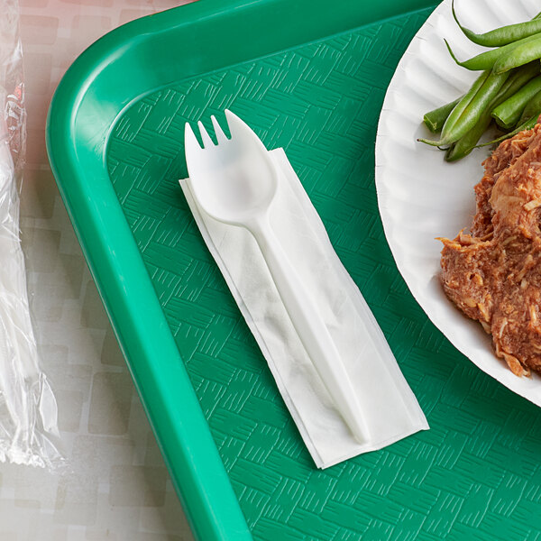 This set includes a spork and napkin so you can provide your guests with everything they need to enjoy their meal! Great for quick grab-and-go applications, this wrapped kit is a cleaner alternative to unwrapped polypropylene plasticware. Plus, since it's all disposable, you won't have to worry about collecting and cleaning silverware at the end of meal service.