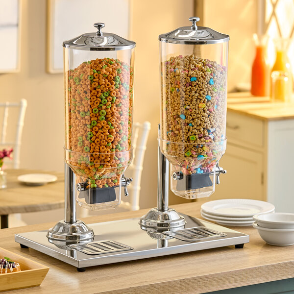 Featuring a sleek stainless steel stand and catch tray, this cereal dispenser elevates your cereal selection off of the countertop, for mess-free service.
