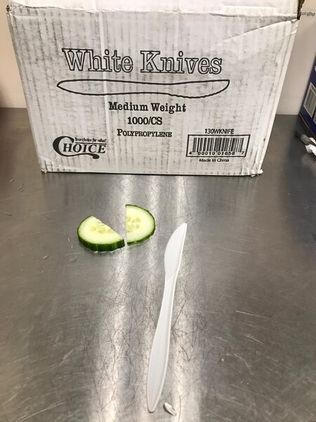 Made of durable polypropylene plastic, these disposable knives are ideal for light-fare and to-go service. Plus, cleanup is a breeze! Use them for breakfast, lunch, dinner, or desserts to conveniently eliminate any warewashing needs and free up your staff to handle other important tasks.