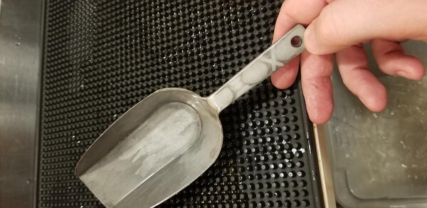 Product wears easily and the finish must be manually scrubbed off to avoid tarnishing wet products. the Scoop is also brittle, and tends to break instead of bending. Not suitable for ice. maybe for dry products.