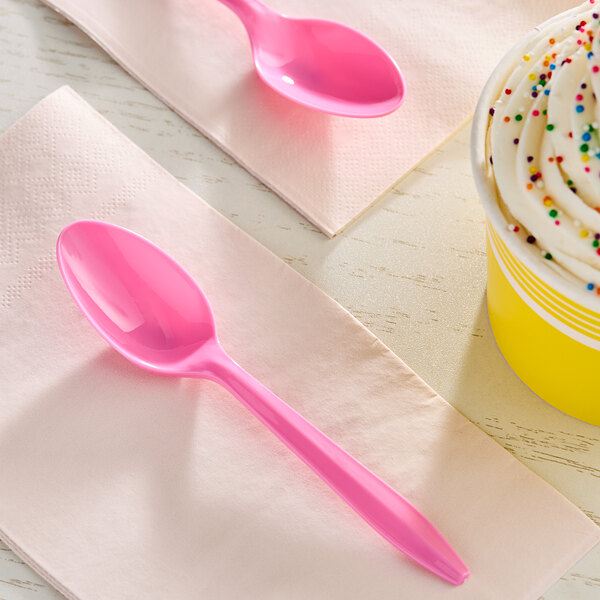 These spoons are perfectly crafted for savoring delectable frozen desserts such as hard ice cream, gelato, and frozen yogurt. Ideal for ice cream shops, concession stands, and fairs, guests will be thrilled with the vibrant pink color.