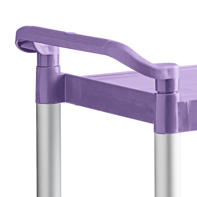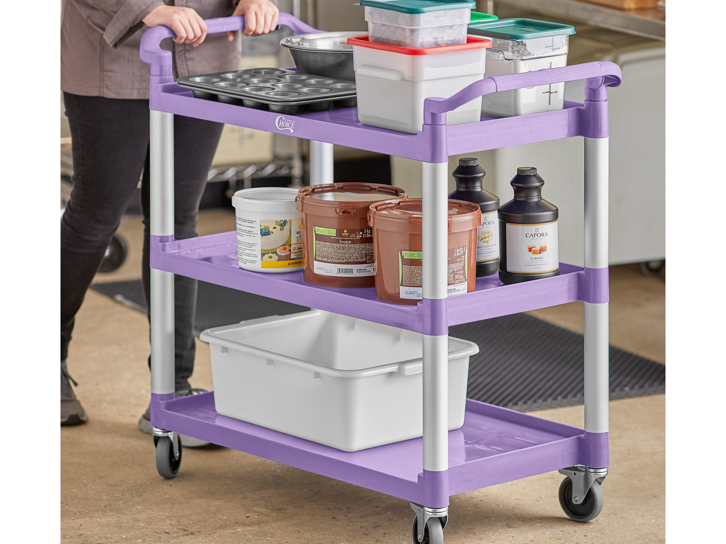 Perfect for restaurants, hotels, janitorial staff, caterers, and more, this Choice purple utility / bussing cart with three shelves is a reliable way to transport a wide array of items.
