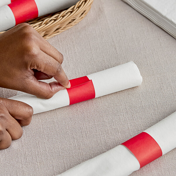 Featuring a vibrant red color, these napkin bands add an attractive touch to your dining area. Perfect for holding rolled napkins and flatware securely in place, these bands are a must-have for restaurants, cafes, and catered events. Ensure a seamless dining experience with these stylish and practical napkin bands!