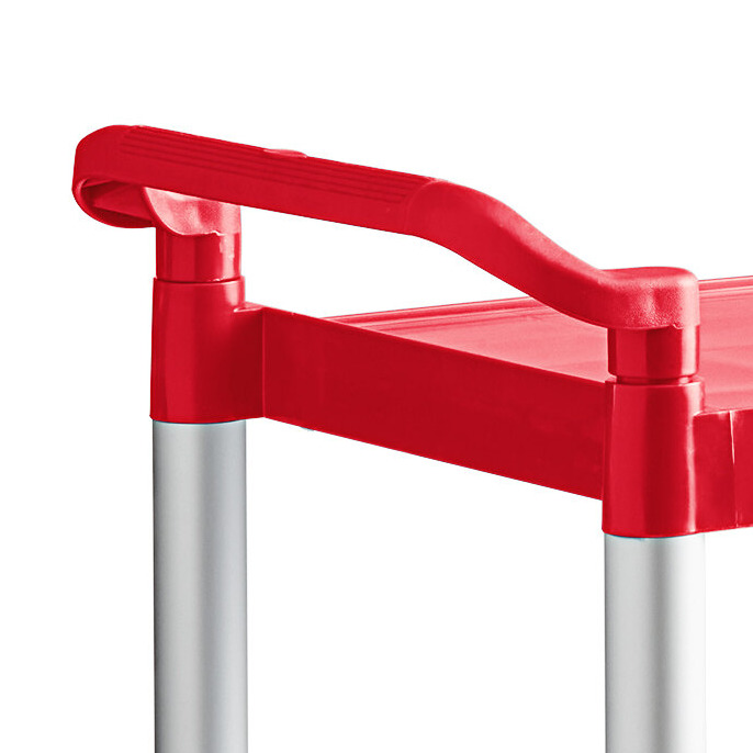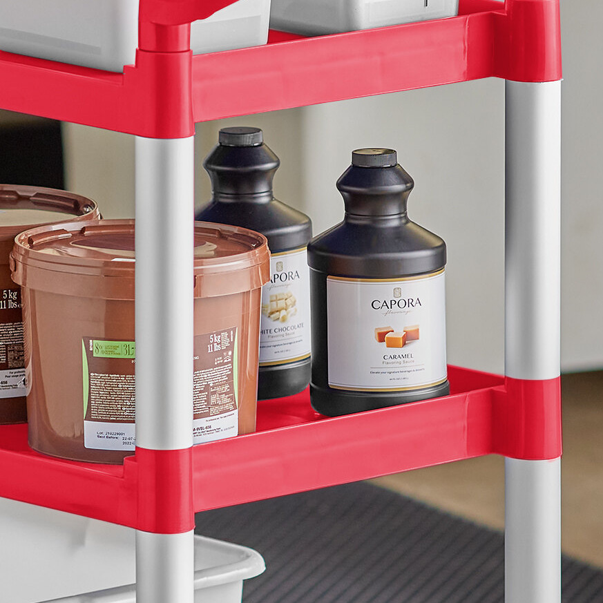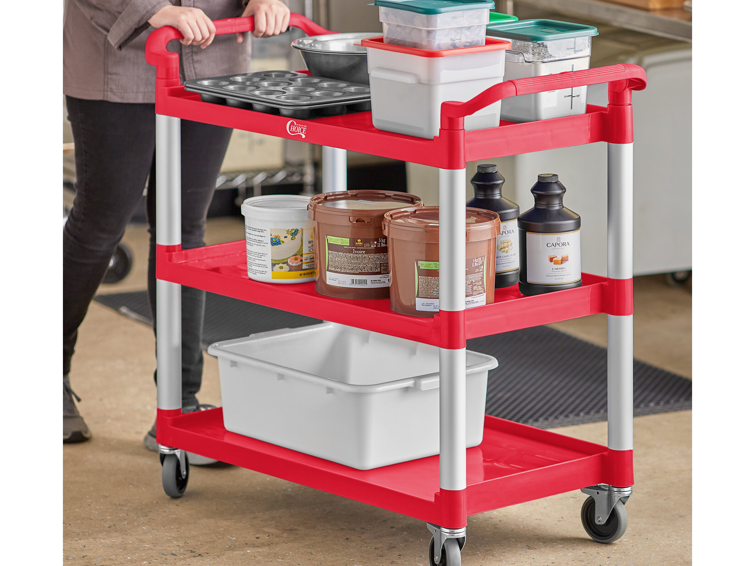 Perfect for restaurants, hotels, janitorial staff, caterers, and more, this Choice red utility / bussing cart with three shelves is a reliable way to transport a wide array of items.