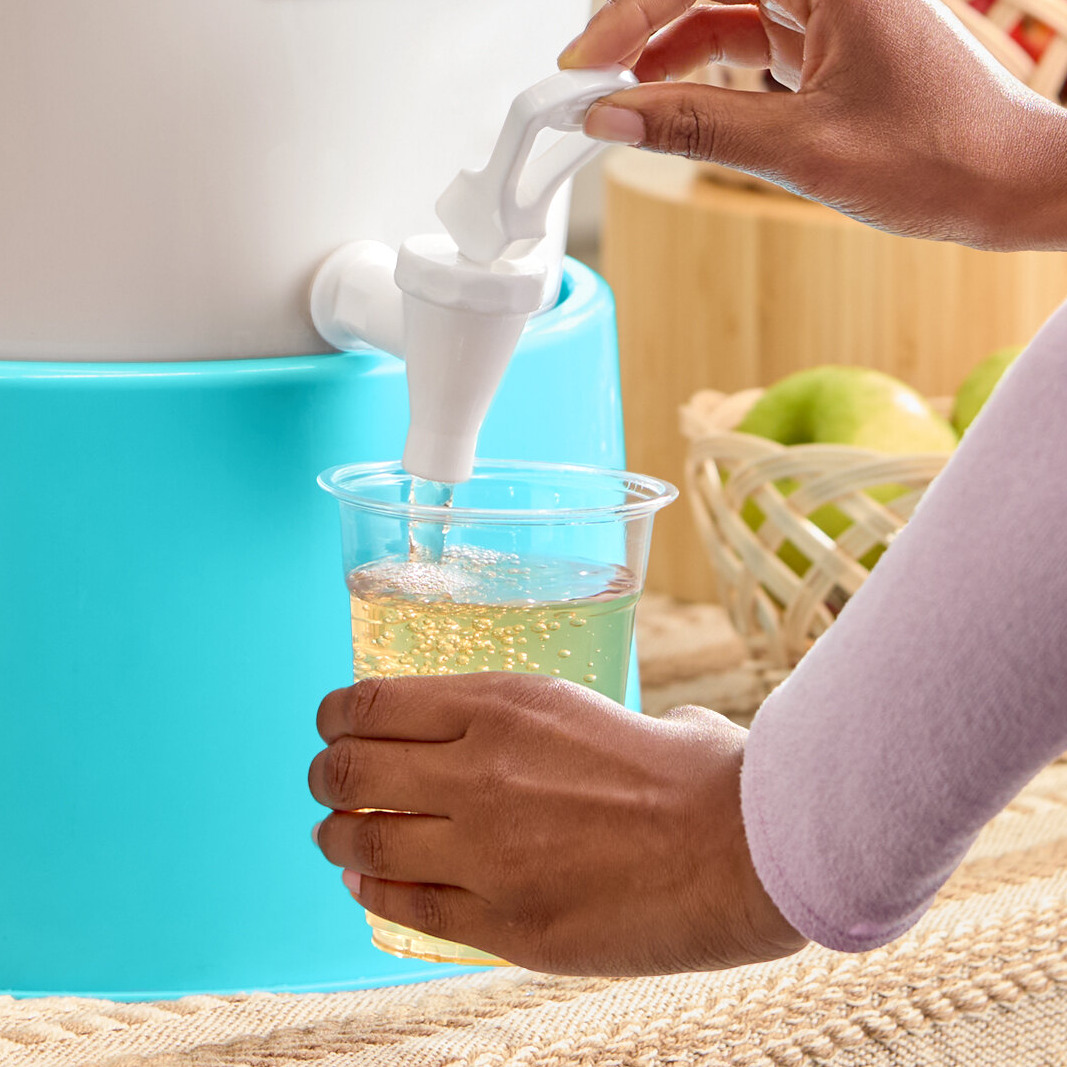 This dispenser's push button faucet allows for seamless dispensing, a faster flow, and fewer drips.