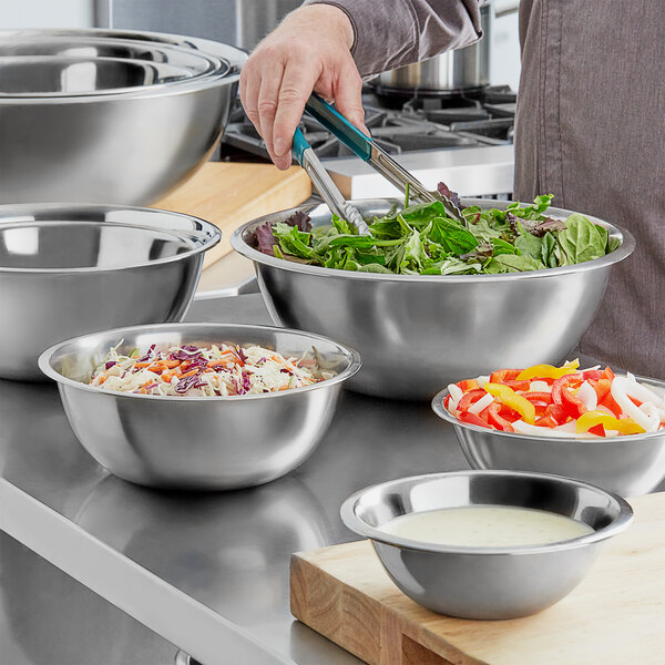 Constructed of durable stainless steel, these bowls are built to last. The standard weight stainless steel also feels light to make for easy handling when dealing with heavy ingredients. For aesthetics, the bowls feature an attractive mirror finish to keep your kitchen looking professional every day. With a large, wide rim, these bowls are easy to hold and handle during use.