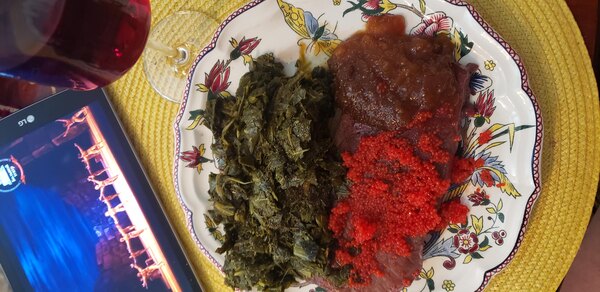 I used to buy fresh collard greens and then by myself cut and braise them. So I tried canned chopped collard greens for the first time. I just warm them and add them along side my New York strip steak on my dinnerplate, with a glass of fine wine. Traditional and classic.