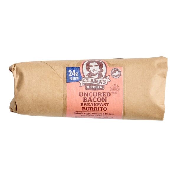 Offer a delicious and convenient breakfast to your on-the-go customers with this Clara's Kitchen bacon breakfast burrito! This product is crafted with the finest ingredients including a soft, white flour tortilla, cage-free whole eggs, potatoes, monterey jack and cheddar cheese, and uncured bacon for a tasty, hearty breakfast option. It's packed with 26 grams of protein to keep your customers full until their next meal. To make it even more convenient, this burrito is individually wrapped and can be heated and served right in the package. To heat, loosen the paper wrapper and heat in the microwave on the highest setting for 90 seconds. Once heated through, peel back the wrapper and serve.