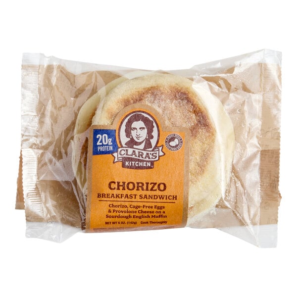 Offer a delicious and convenient breakfast to your on-the-go customers with this Clara's Kitchen chorizo breakfast sandwich! This product is crafted with the finest ingredients including a sourdough english muffin, cage-free whole eggs, spicy chorizo, and provolone cheese for a tasty, nutritious breakfast option. It's packed with 20 grams of protein to keep your customers full until their next meal. To make it even more convenient, this sandwich is individually wrapped and can be heated and served right in the package. To heat, loosen the wrapper and heat in the microwave on the highest setting for 90 seconds. Once heated through, let the sandwich cool for one minute before eating, then peel back the wrapper and serve.