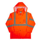 Keep workers visible and protected from rain with this Ergodyne GloWear 8366 rain jacket. This jacket offers comfortable protection against the elements, making it ideal for construction workers, parking lot attendants, crossing guards, and emergency response crews. With a bright orange color, this jacket draws attention to the individual wearing it for increased safety on the job. It has 2" silver reflective tape across the chest and arms, providing enhanced visibility at night or in low-light conditions. This Class 3, Type R jacket is designed for roadway occupational use, and it maintains compliance with ANSI/ISEA 107-2020 standards.