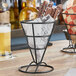 Create an eye-catching presentation of starters or sides with this Clipper Mill by G.E.T. 4-61640 5" x 7" black wire cone basket! Whether you're serving traditional french fries or sweet potato fries, this wire cone basket is sure to add a contemporary touch to your tabletop display. It's even great for mozzarella sticks, jalapeno poppers, or fried zucchini sticks! Simply place a liner in the cone, add your signature finger foods, and serve.