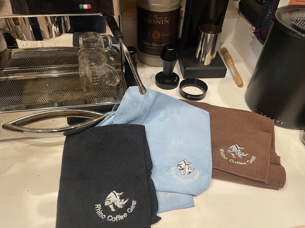 Nice set of espresso machine cloths. I like the color coding and that one has a grommet and carabiner to hang. All the towels feel quality and the engraving is nice. You get two steam wand towels so easy to keep them rotating.