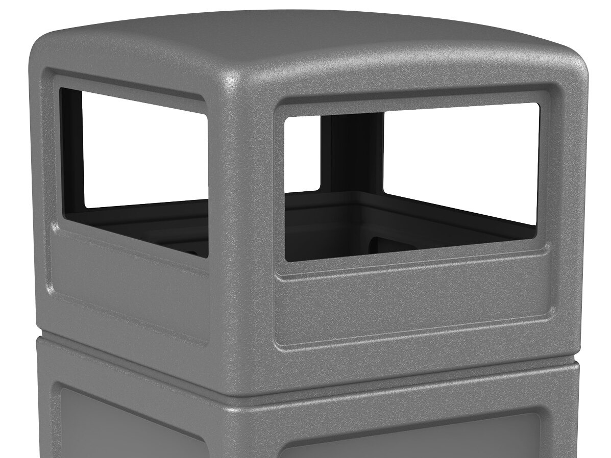 A dome-shaped lid fits snugly atop the unit's frame and features large 13'' x 6'' openings on all four sides to allow for convenient disposal.