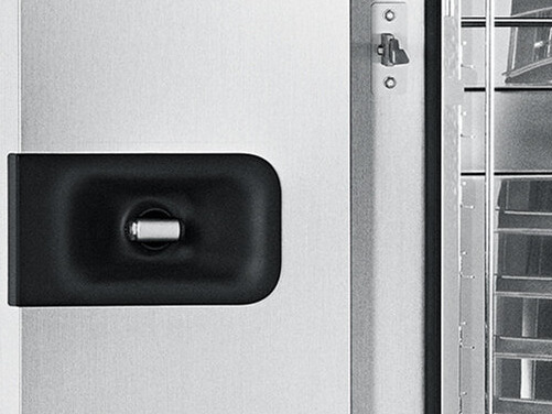 The right-hinged door can be slammed shut without breaking, which is great for busy kitchen environments. It features a two-stage handle with safety vent protection to help avoid injuries from steam, and the door opens and slides out of the way to free up aisle space, improving loading ergonomics and kitchen safety.