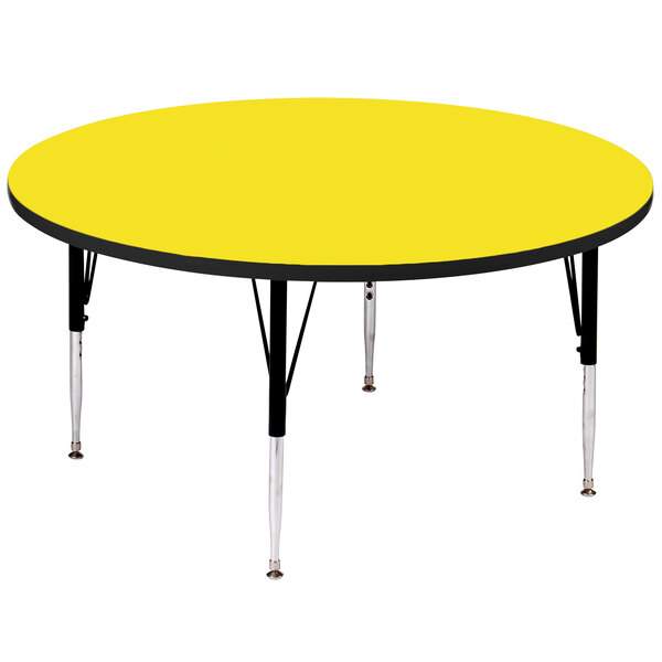 Provide a reliable work surface for a variety of tasks with this Correll A42-RND-38 42" round 19" - 29" yellow adjustable height high-pressure top activity table. This table has a durable high-pressure laminate top with a sturdy 1 1/4" thick high-density core so it can stand up to frequent use by students or office staff. The top also has a backer sheet to resist warping over time. It is resistant to wear, scratches, stains, and food which makes this table a great choice for science or art classes. Plus, the rounded corners ensure that there are no sharp points for students or staff to bump into. For superior versatility, this table easily adjusts between 10 heights ranging from 19" to 29" in 1" increments. This height range allows it to be used as a desk or work station for children and adults. A wrench is included for quick height adjustments.