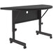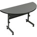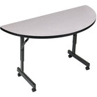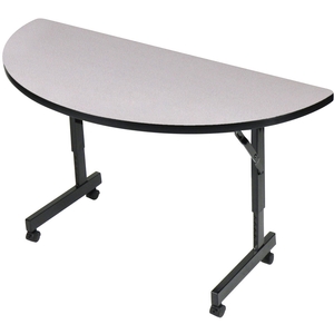 This Correll EconoLine 24" x 48" gray commercial thermally fused melamine top mobile flip-top, adjustable-height, half-round table is perfect for banquet facilities, conference rooms, and any other area where storage space is at a premium. This table features 2 black 1" x 2" x 20" 16 gauge steel pedestals and a matching H-frame give this table excellent stability. It also features casters, which create less friction on the ground and make it easy to move the table, even when it is loaded with heavy objects.