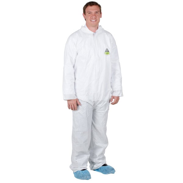 Made of an anti-static composite fabric, these coveralls are lighter and cooler than many other styles while still offering ample protection from varnish, resins, fiberglass, paints, and sanding dust. For greater freedom of movement and durability, these coveralls are generously cut in the seat and arms to ensure that your employees won't experience any rips on the job. Use them wherever a high level of protection from contaminants is desired, such as with fertilizer, sewage, dust, dirt, or pesticides. Safe for food contact, these coveralls are also perfect for large food processing facilities.