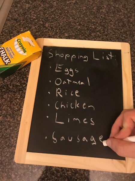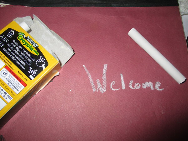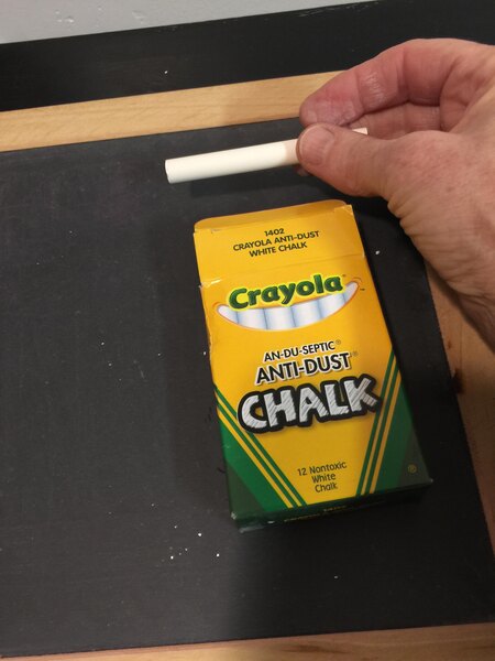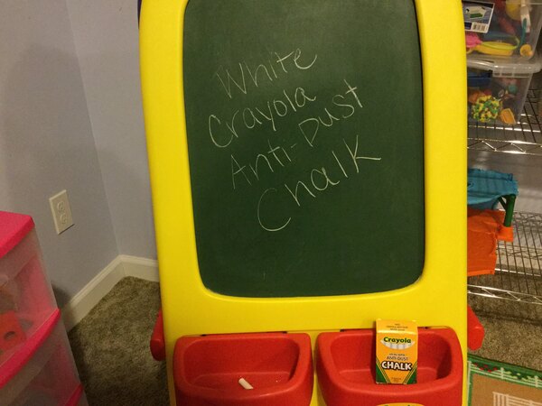 I'm loving this crayola chalk so far – it's non-toxic, low dust, and highly visible on my chalkboard. Comes with 12 sticks to a package (which should last me nearly a year.)