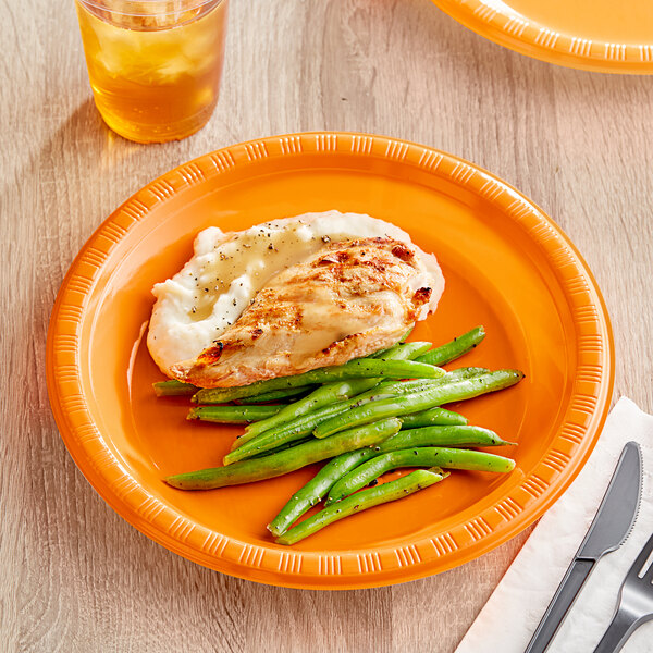 We used this Creative Converting 7-inch sunkissed orange plastic plate for a Halloween picnic and it's great. It has a good weight for a plastic plate. Not bad at all.
