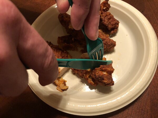 These are great plastic knives. The bend enough not to be brittle and snap but not so much that you have an issue cutting through chicken or steak with them.