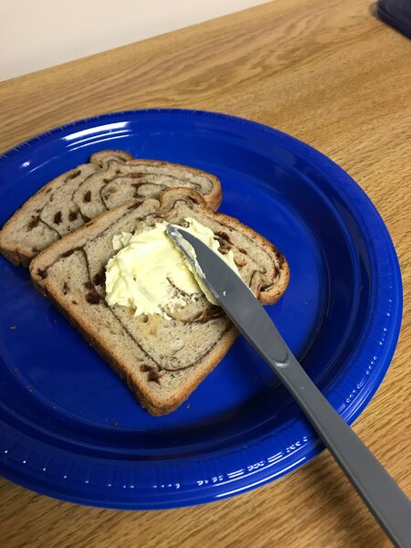 Good navy blue knife for cutting food when you don't want to use a metal utensil. Does a good job spreading jelly and peanut butter on bread.