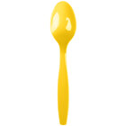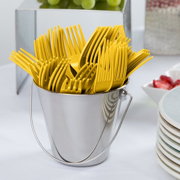 Take your tabletop presentation to the next level with this Creative Converting 7 1/8" School Bus Yellow heavy weight plastic fork. This heavy weight fork provides a bright and colorful alternative to other disposable silverware at your banquet table, catering tray, or buffet line. In addition to its bright color, this fork is disposable, meaning you won't have to waste time washing large quantities of dishes like you would if you used traditional silverware. The disposable design also offers convenience during teardown for servers and catering staff, without affecting the overall dining experience of your patrons. Additionally, you won't need to worry about losing money due to expensive flatware being accidentally thrown away.