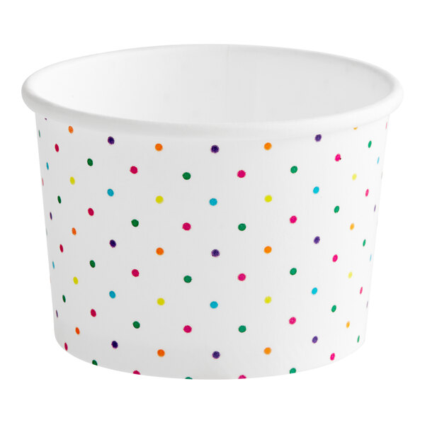 Designed for ice cream shops, concession stands, diners, restaurants, and bakeries, this versatile cup is perfect for serving take-out ice cream, frozen yogurt, and other menu favorites. Its eye-catching bright polka dot color scheme helps add a pop of personality to any setting.