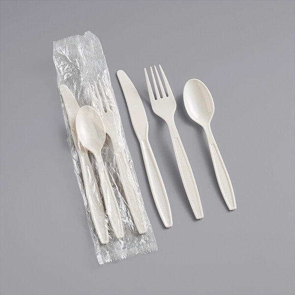 Thanks to the disposable design, you won't have to worry about collecting silverware after each use, making cleanup a breeze. Wrapped in a clear poly wrapper, each set is protected from contamination and debris, keeping it sanitary during storage. You can give them to your customers in to-go boxes and take-out bags or fill your flatware bins with them for guests to grab on the go at your quick-serve restaurant.