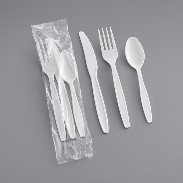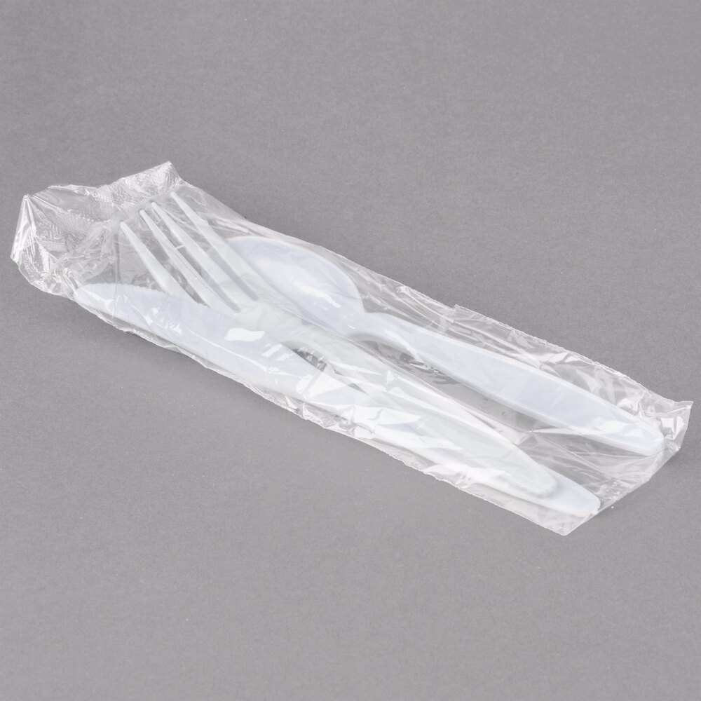 This plastic cutlery pack comes complete with a fork, a spoon, and a knife, making it perfectly suited for take-out orders, food trucks, concession stands, and catered events. You can give them to your customers in to-go boxes and take-out bags or fill your flatware bins with them for guests to grab on the go at your quick-serve restaurant.