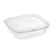 Securely seal a variety of food items with this Dart ClearPac SafeSeal 24 oz. tamper-resistant, tamper-evident hinged container with flat lid. Specifically designed to inhibit tampering, this 24 oz., square container comes with Dart's tamper alert hinge, which protrudes outward when torn, alerting your customers that the container has been opened. This PET plastic container's tamper alert hinge remains attached to the container, eliminating loose plastic pieces as well as the need for shrink bands and wrap labels - saving your business time and money, all while reducing waste. Use this container to hold bulk food, dips, salads, granolas, fruits, and veggies at your deli, salad bar, or grab-and-go counter.
