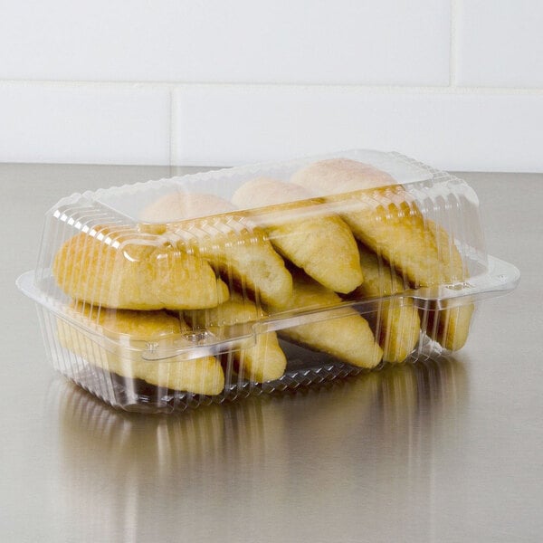 The Dart PET35UT1 9" medium oblong container is designed with a label window for placement of a tamper evident seal (sold separately), giving you and your guests peace of mind in merchandising. Sidewall ribbing adds the strength and durability needed for commercial use, while the stackable design makes it ideal for retail applications.