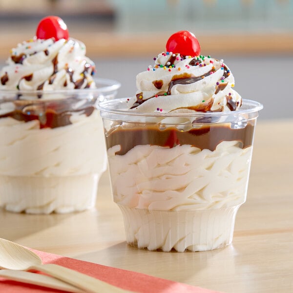 Sundae cups that are disposable. Great item! they work best with a bit of syrup so you can see the jam swirl around your vanilla ice cream