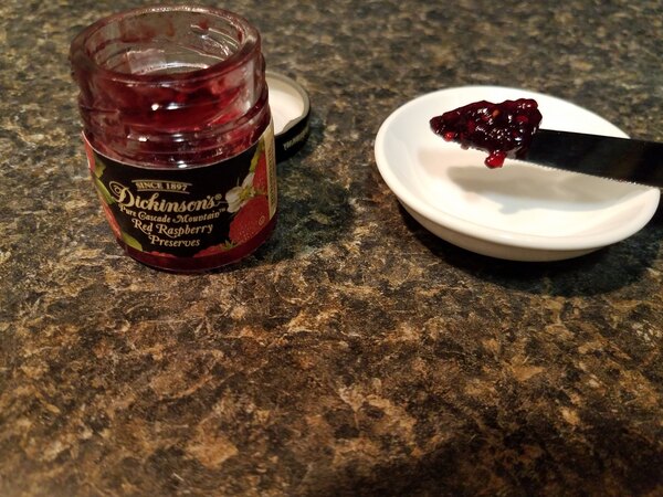 The Dickinson's one ounce jar of red raspberry preserves are thick and delicious. They are a great paring with biscuits and taste just like home made.