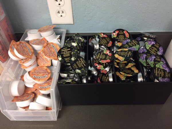 We love these small portion cups of jams/preserves from Dickinson's. The plastic cups are perfect for to go orders of bagels and toast. The portion is just right for a slice of toast, and it allows customers to get multiple flavors.