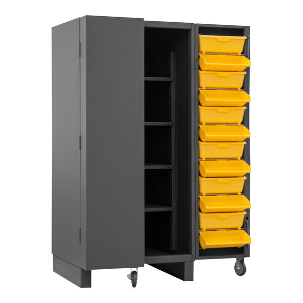 Equip your garage, warehouse, packing station, or shipping and receiving department with this Durham Mfg 4-shelf steel storage cabinet with 24 yellow tilt bins. This handy unit keeps tools and supplies organized and easy to access. To provide ample storage space, the cabinet features 4 adjustable shelves with a capacity of 1,900 lb. per shelf to accommodate a wide variety of parts and supplies. The fully welded louvered panels include 24 yellow Hook-On Bins to hold small tools and hardware. The bins tilt open at a 50-degree angle, while the doors open at 180 degrees for full access to the contents inside.