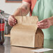 Enhance your customers' shopping experience with the Duro Load & Seal 10" x 6 3/4" x 12" brown paper shopping bag with handles! Crafted from sturdy paper, this bag features a flat bottom that ensures items remain upright during transportation. The Load & Seal design incorporates durable handles, making it effortless for customers to carry their purchases with ease. For added security, the bag can be sealed with the tamper-evident adhesive strip lined inside the bag, providing peace of mind for both customers and retailers.