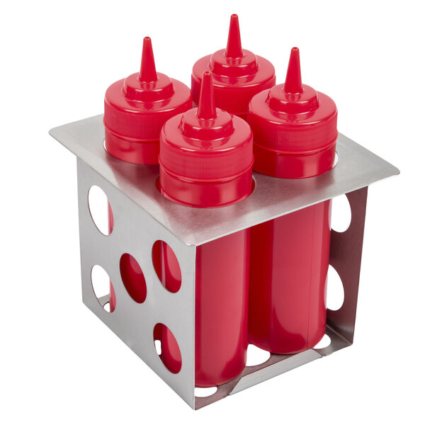Designed to keep condiment bottles organized and upright, this bottle holder is a convenient addition to any commercial prep station. Plus, because it's made of stainless steel, it's sure to provide long-lasting use. With this bottle holder nearby, salad dressing, sauce, ketchup, or other toppings are easier than ever to reach, remove, and replace.