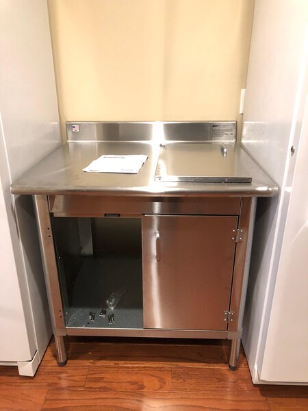 Boost your available storage and work space with this Eagle Group T3048BA-BS-HGD 30" x 48" work table with cabinet kit! Perfect for commercial kitchens, workshops, and more, this unit boasts a strong and sturdy type 430 stainless steel top that's great for a wide range of uses, while a 4 1/2" backsplash protects your walls. A galvanized undershelf, stainless steel side panels, and hinged doors with chrome pull handles fully enclose the front and sides of the base and offer a place to keep extra supplies or tools, while the rear is left open.