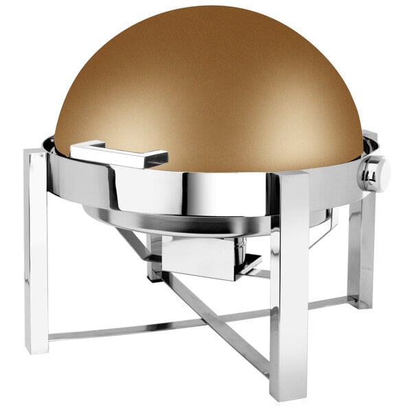 Elevate your contemporary buffet presentation with this Eastern Tabletop 3148RZ P2 8 qt. round bronze coated stainless steel roll top chafer. This chafer's heavy-duty, 18/10 stainless steel construction and color-infused xylo bronze coating guarantee a long-lasting, professional look. It's durable yet lightweight enough to provide effortless transportation, set-up, and tear-down. Not only does its sophisticated dome cover help keep food warm and covered to prevent contamination, it also has a brake lock system to prevent it from creating any unnecessary banging upon closing. Once your event is over and your guests have left, the cover is removable for easy cleaning.