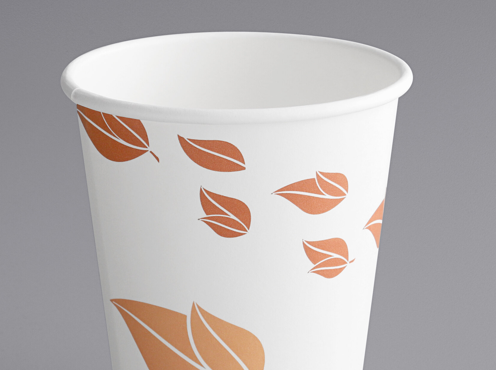 Both stylish and economical, this coffee cup is the perfect hot beverage solution for concession stands, coffee shops, convenience stores, cafeterias, or office break rooms. It has a thick paper construction for superior durability and quality, single-service use. Plus, it features a crisp, white background with an attractive leaf design that will show your customers that your establishment cares about the environment.