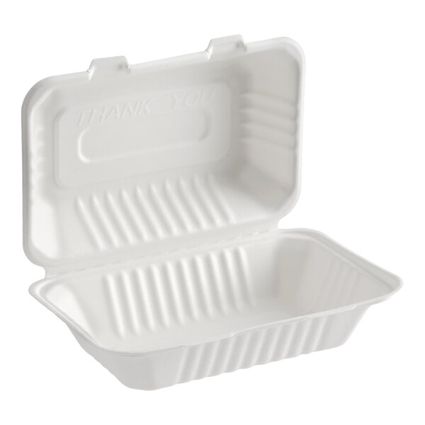 The EcoChoice 9" x 6" x 3" compostable white plant fiber 1 compartment take-out box is perfect for restaurants, caterers, and sandwich shops that serve anything from hot entrees to cold salads. Package up take-out orders or leftovers for your customers while also taking a step toward going green with this environmentally smart option!