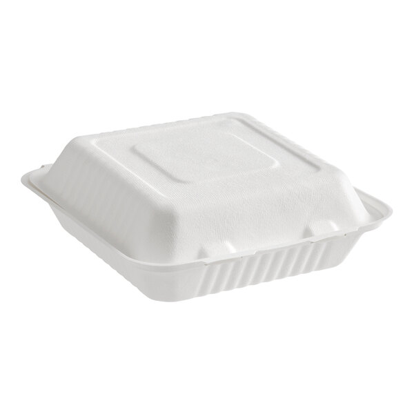 The EcoChoice 9" x 9" x 3" compostable white plant fiber 1 compartment take-out box is perfect for restaurants, caterers, and sandwich shops that serve anything from hot entrees to cold salads. Package up take-out orders or leftovers for your customers while also taking a step toward going green with this environmentally smart option!