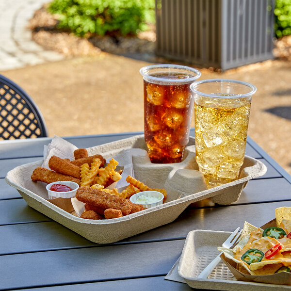 A great eco-friendly choice for your business, this carrier with tray is made from rough molded fiber and 100% recycled material. Versatile for a variety of beverage sizes, each of the cup holders can hold an 8 oz. to 44 oz. cup with a pedestal base. The ample tray section is ideal for holding hamburgers, hot dogs, french fries, baked goods, and sandwiches. For optimal usage, be sure to first place a layer of deli paper on the tray section before placing food on it.