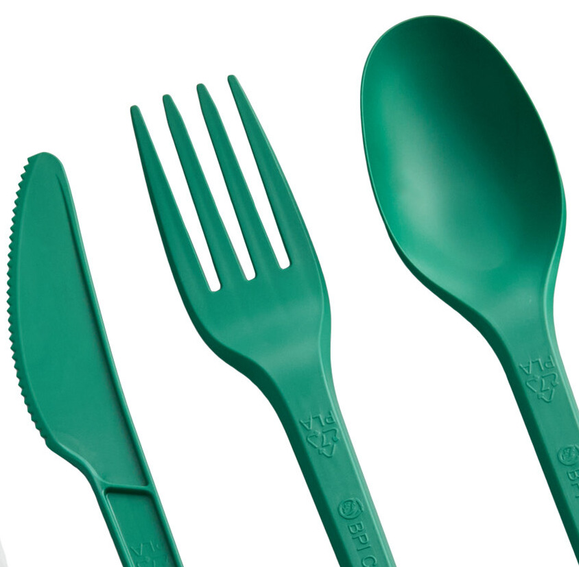 Spoon and Fork set by EcoChoice is heavy duty, won't break easy and best of all it's a compostable item, and a nice color - green.