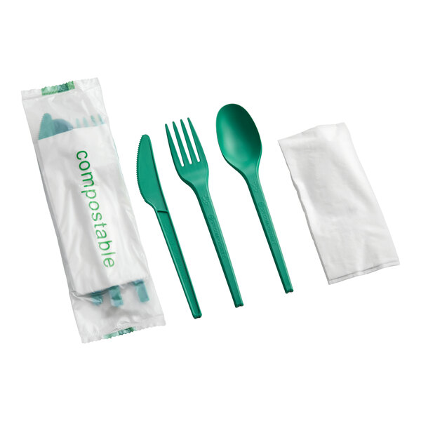 Offering a more sustainable option for disposable cutlery, these EcoChoice wrapped kits include a heavy weight 6 1/2" green knife, fork, spoon, and napkin. An ideal alternative to traditional, petroleum-based plastic utensils, the cutlery is BPI certified and made of CPLA (crystalized polylactic acid), a plant- and chalk-based plastic that's formed with renewable resources to minimize environmental impact upon disposal.