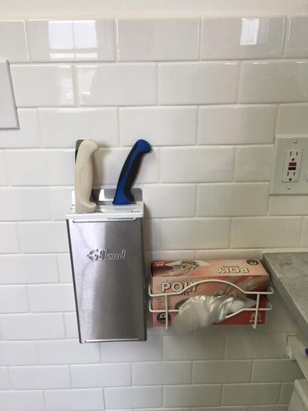 This thing is great! Stores the knives and sharpener right within arms reach!