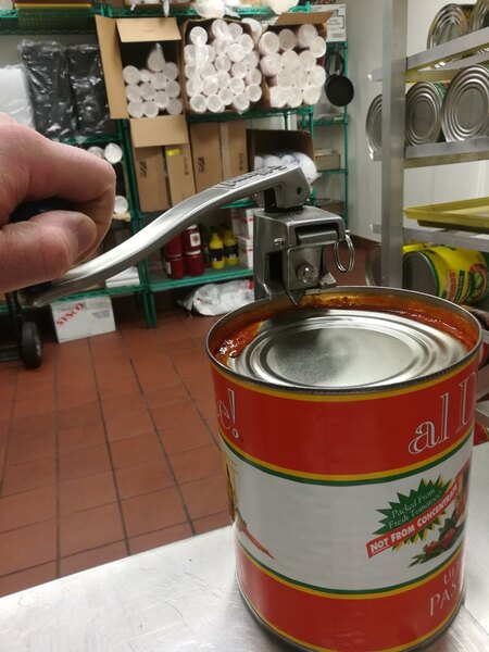 the all staineless manuel can opener is a great tool to have in the kitchen it opens at your pace not a motors so if your in a rush its no problem that you wont be able to open it quick