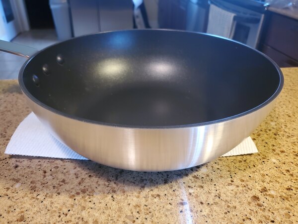 This stir fry pan is constructed with 3.5 mm thick aluminum. This material provides superior heat distribution throughout the pan, ensuring a more even fry. The light weight of this pan combines with its high-sloped sides to make it perfect for tossing.